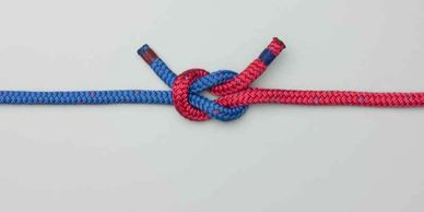 Take two ropes and cross them (red over blue) to form a half knot. Cross them a second time (red over blue again) and pull the ends tight to form the Square Knot.