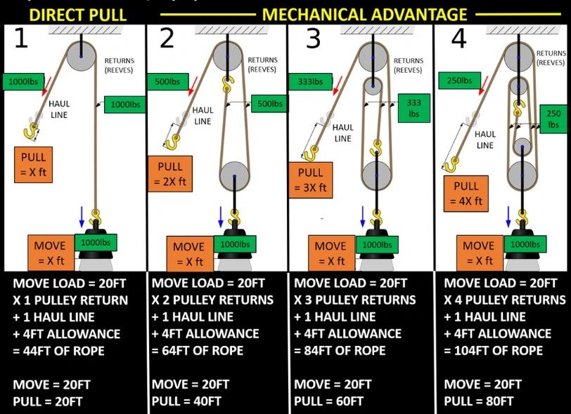 x (multiply by) the Number of Returns (Reeves) through the entire Pulley System